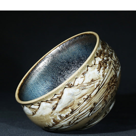 Pure handmade glazed tears Jianzhan teacup thousand miles of Jiangshan picture Jianyang iron tire teacup master cup kiln change gold silk blue peacock